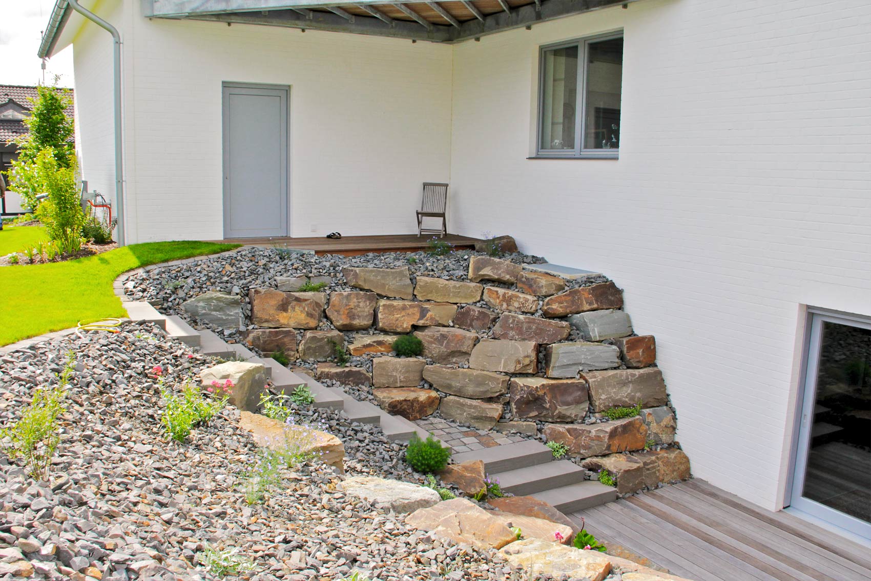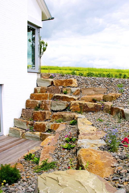 Beim Einsatz der verschiedensten Baumaterialien, wie Natur- oder Betonsteinen, Pflaster, Platten, Holzdielen, Treppen oder Trockenmauern, kommt es nicht nur auf den handwerklich fachgerechten Einbau an, vielmehr sind hier Fragen des Verwendungszwecks und nicht zuletzt gestalterische Gesichtspunkte zu berücksichtigen. Zum Beispiel: welcher Terrassen- oder Wegebelag kann am harmonischsten zu Stil und Farbe des Hauses passen?